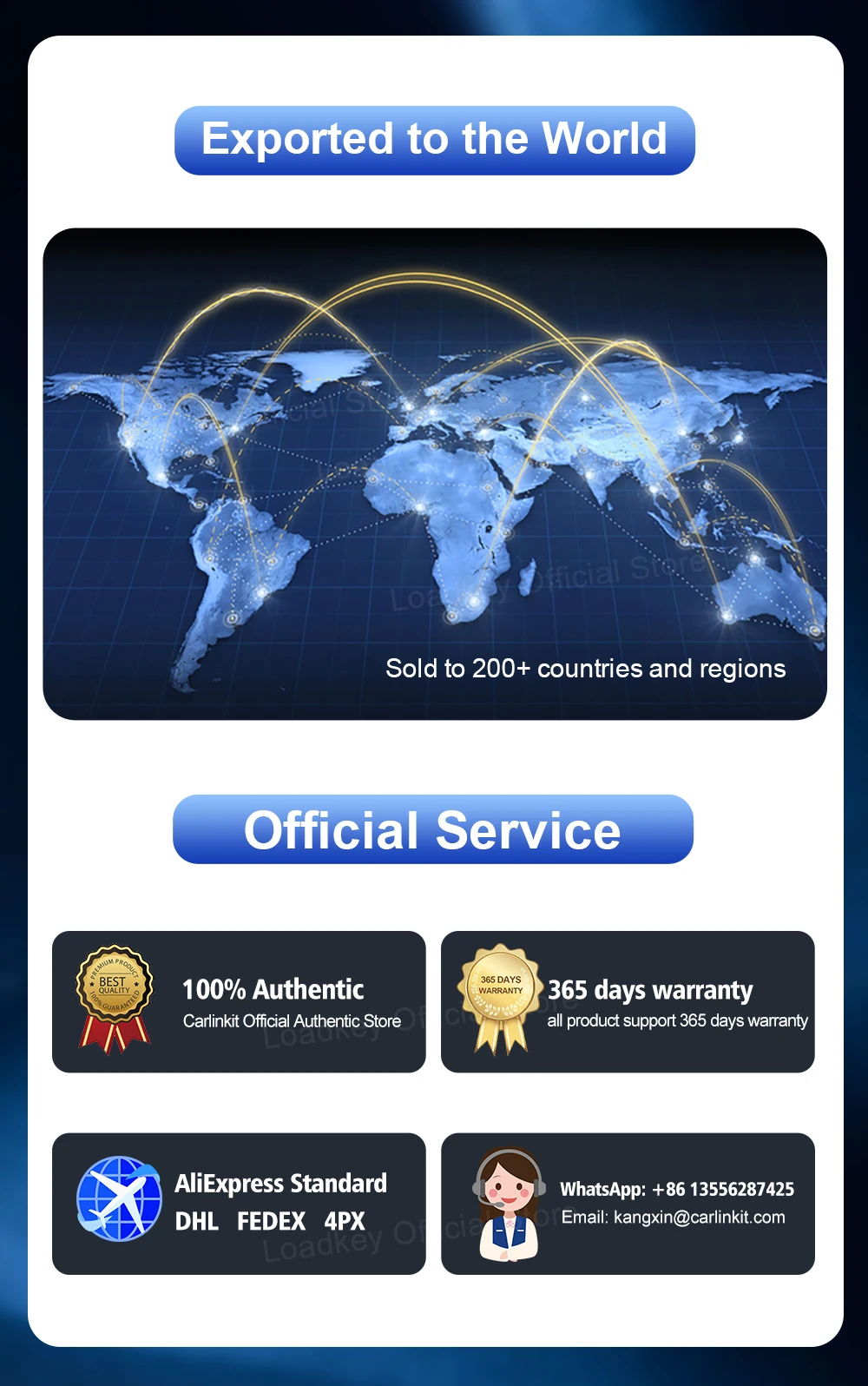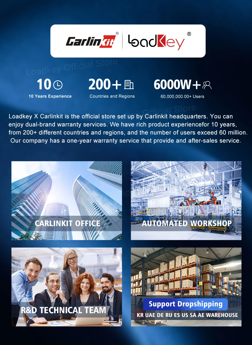 Loadkey X Carlinkit is the official store set up by Carlinkit headquarters. You can enjoy dual-brand warranty services. We have rich product experience for 9 years, from 200+ different countries and regions, and the number of users exceeds 60 million. The company has a one-year warranty service that we provide and after-sales service It is committed to sell 100% original authentic products.